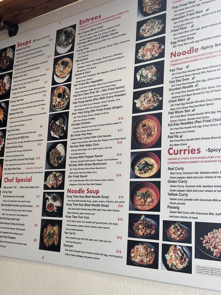 “ The food is delicious! The restaurant is nice and clean. For the amount of food we ordered we got out food pretty fast. We ordered Sweet and sour pork, pad thai, Tom yum soup, fried rice all of it was delicious. I recommend their pink drink and its tasty. Their Thai Ice tea is on point too! ”